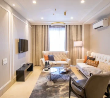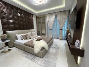 Elegant curtains, plush carpets, stylish bedding, and exquisite decor pieces bring this sample flat to life.